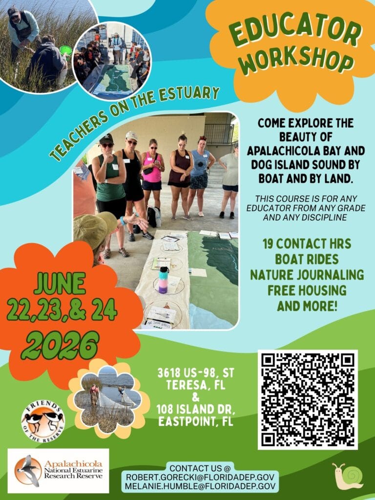 Come explore the beauty of Apalachicola Bay and Dog Island Sound by boat and by land. This class offers opportunities to learn how to use nature journaling as an interdisciplinary tool for teaching students of all ages and abilities. Nature journaling is an inquiry-based method that uses numbers, words, and pictures to explore students’ own questions and ignite their curiosity. Teachers will use it as an access point to learn about the estuarine ecosystem, and its versatility will be demonstrated on the Apalachicola National Estuarine Research Reserve boat, the FSU Coastal Marine Lab boat, as well as in the marsh and on the shoreline. Come and meet the wonders of our watershed and join other educators to share best practices. We will also present a travelling trunk that contains everything you need, including a wave tank that allows students to become restoration and ecosystem scientists working on living shorelines and erosion prevention. These trunks will be available to sign out from us and also several other locations throughout the state of Florida for the 2026/2027 school year.