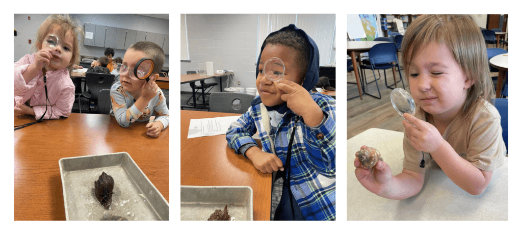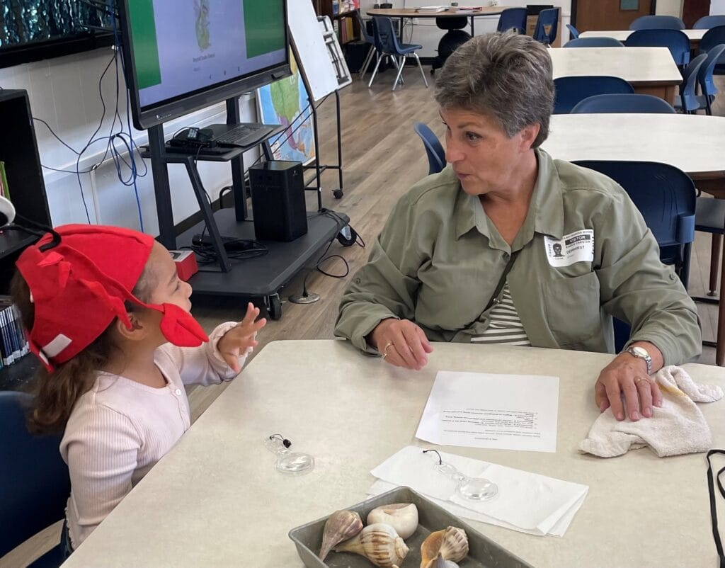 2026 began in a delightful way with education staff, a Training and Engagement assistant, and a Friends of the Reserve board member visiting pre-K classrooms. The class begins with posing a question: Where do shells come from? Among many entertaining theories were the following: seahorses in a little factory, mermaids, the ocean, lobsters, snails, crabs, and turtles. Students examined live snails, live hermit crabs and empty shells at different centers. They still seemed a little dubious when we explained that the snail had made the shell. The students met more critters from the story A Home for a Hermit Crab. The students all enjoyed the story and solving the mystery of “who made the shell?”