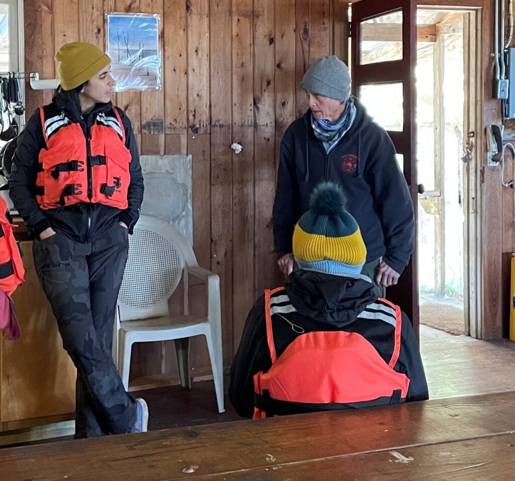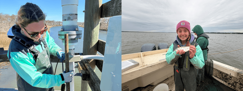 Left: Meredith helps swap the dataloggers at ANERR’s Little St. Marks water quality tower. Right: Meredith assisting with fish counts on a cold winter trawling day.
