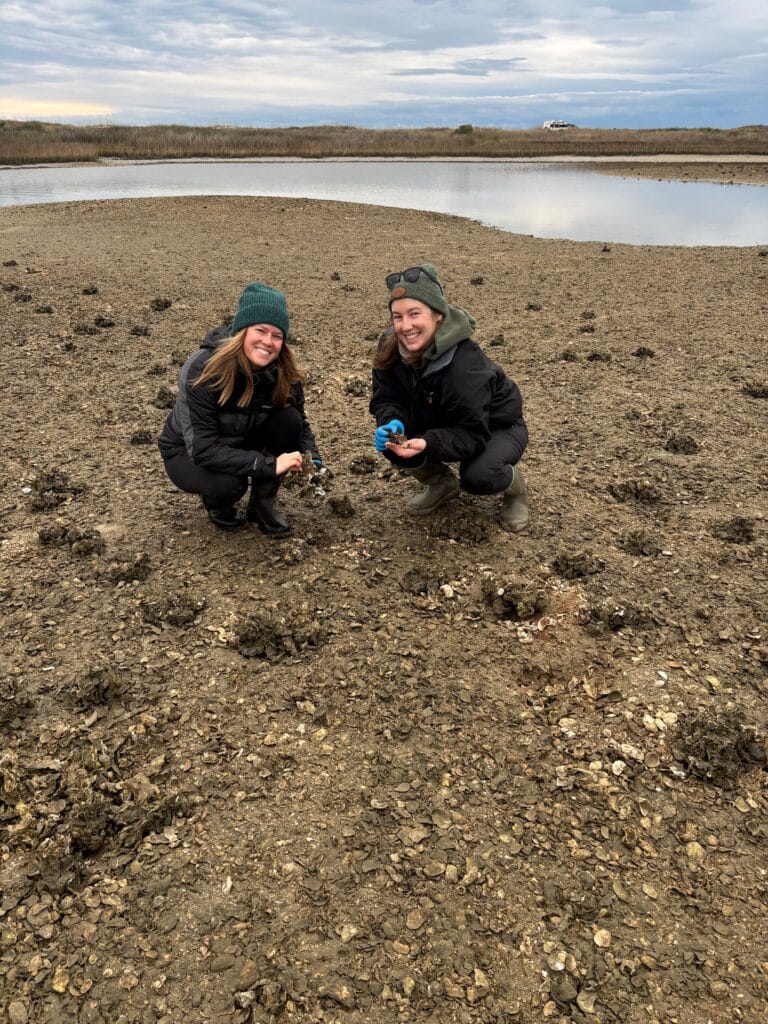 Stewardship staff searching for Flat Tree Oysters at an intertidal oyster reef site.