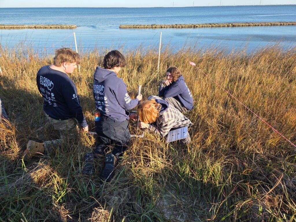 Dr. Mark Clark, Associate Professor of Wetland Ecology in the UF/IFAS Department of Soil, Water, and Ecosystem Sciences, and Dr. Savanna Barry with UF/IFAS Sea Grant demonstrated the construction of Oyster Habitat Restoration Panels—engineered, environmentally compatible structures designed to function as oyster substrate and low-profile breakwaters in shallow-water environments. Corps members constructed six panels during the training, which will be deployed in local restoration projects.