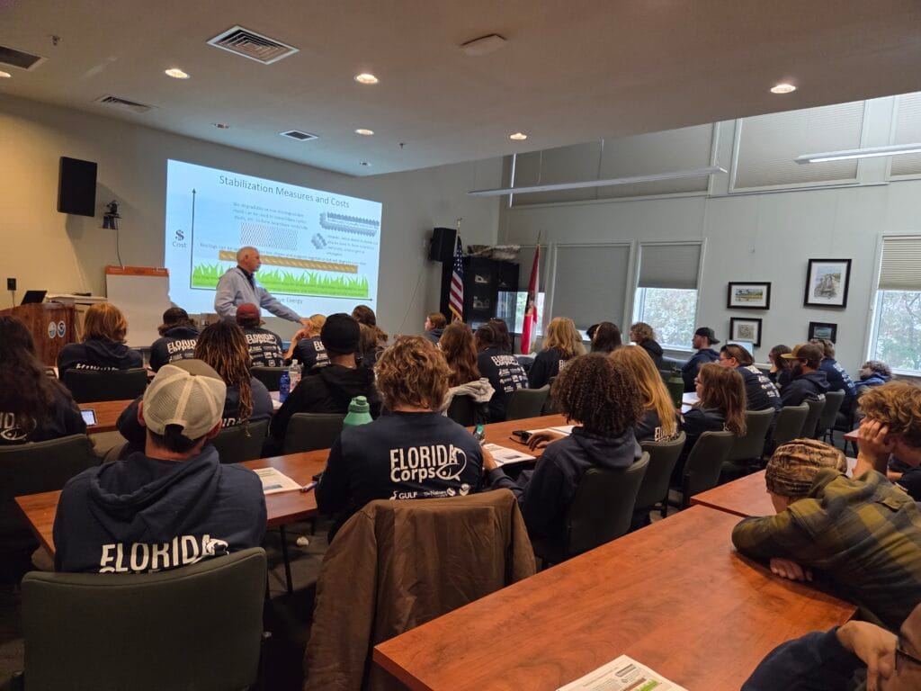 The Apalachicola National Estuarine Research Reserve collaborated with regional partners to host a week-long coastal restoration training for the Oyster Corps February 2–6. The academy featured classroom instruction and field-based demonstrations led by restoration practitioners from across the Florida Panhandle. Sixty Oyster Corps members—from Pensacola to Apalachicola—participated in the training, which was delivered in partnership with the Pensacola and Perdido Bay Estuary Program (PPBEP), UF/IFAS Sea Grant, Choctawhatchee Basin Alliance, Bay County, AmeriCorps, Florida Corps and the Apalachicola Reserve.