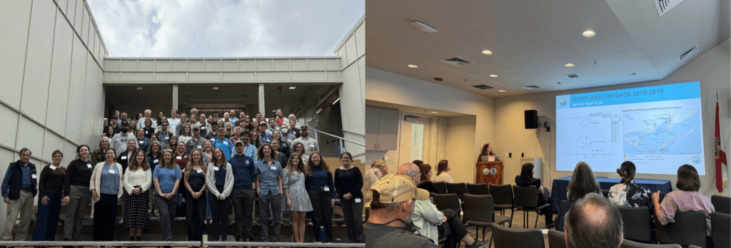 Left: Attendees pose for a group photo! Right: Reserve staff member Samantha Lucas presents about the zooplankton communities in Apalachicola Bay.